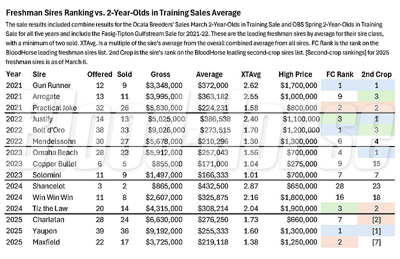 A review of the combined results from the Ocala Breeders' Sales March 2-Year-Olds in Training Sale and OBS Spring 2-Year-Olds in Training Sale for 2021-25 with Fasig-Tipton's The Gulfstream Sale results included for 2021-22 does show some correlation between price and future race results particularly among the sires that would ultimately rank in the top three on the BloodHorse leading freshman sires list.